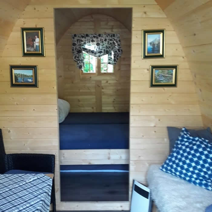 Liten halvtønne med dobbeltseng og lite oppholdsrom. Det er med dyner og puter. Vi har utleige av sengetøy om du treng det.